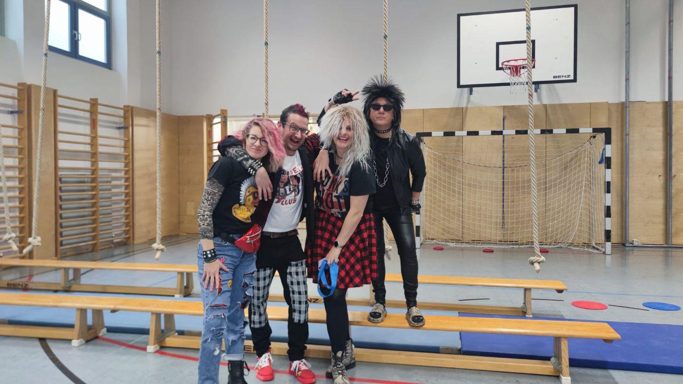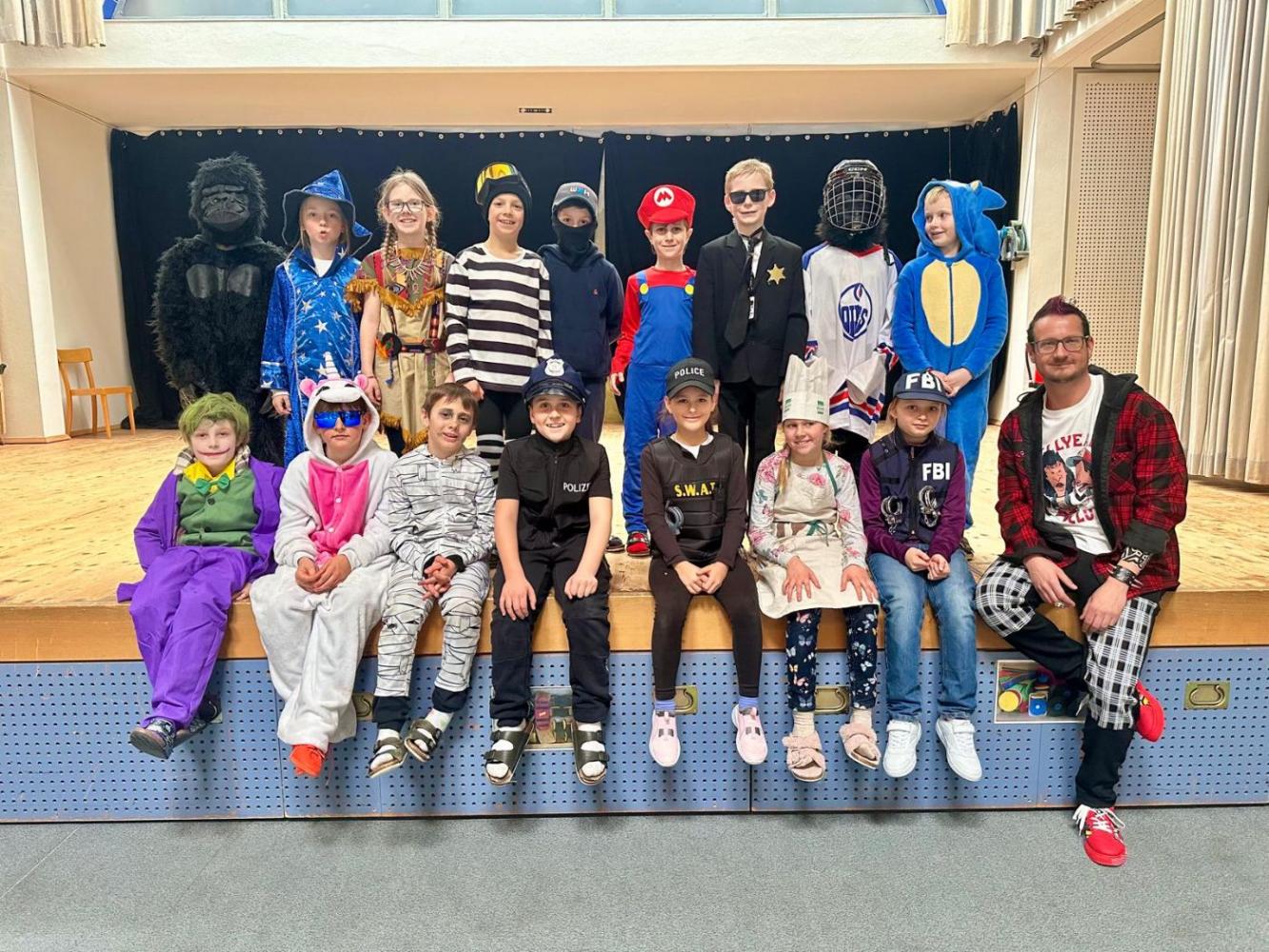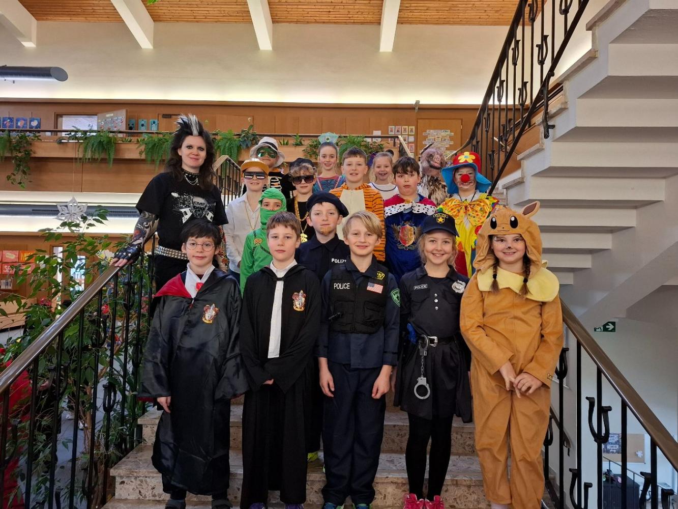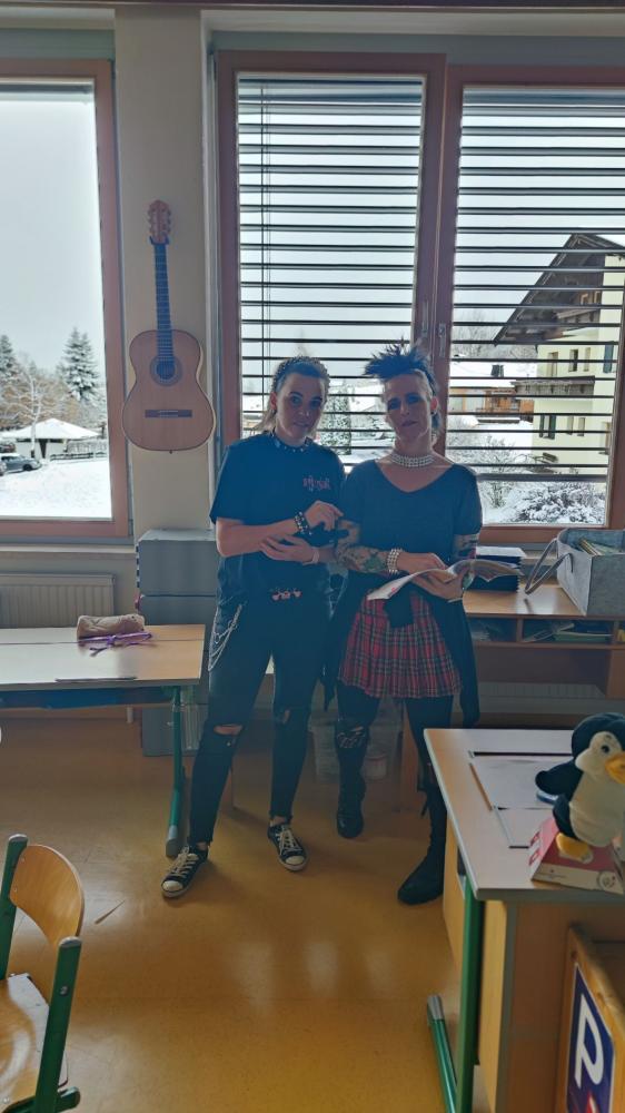 Schon in der Früh staunte man über die vielen kreativen Kostüme: Prinzessinnen, Superhelden, Tiere, Clowns und andere lustige Figuren tummelten sich im Schulhaus. Unsere Lehrerinnen und Lehrer sorgten heuer als coole Punks und Rocker für besondere Highlights und brachten alle Kinder zum Schmunzeln.