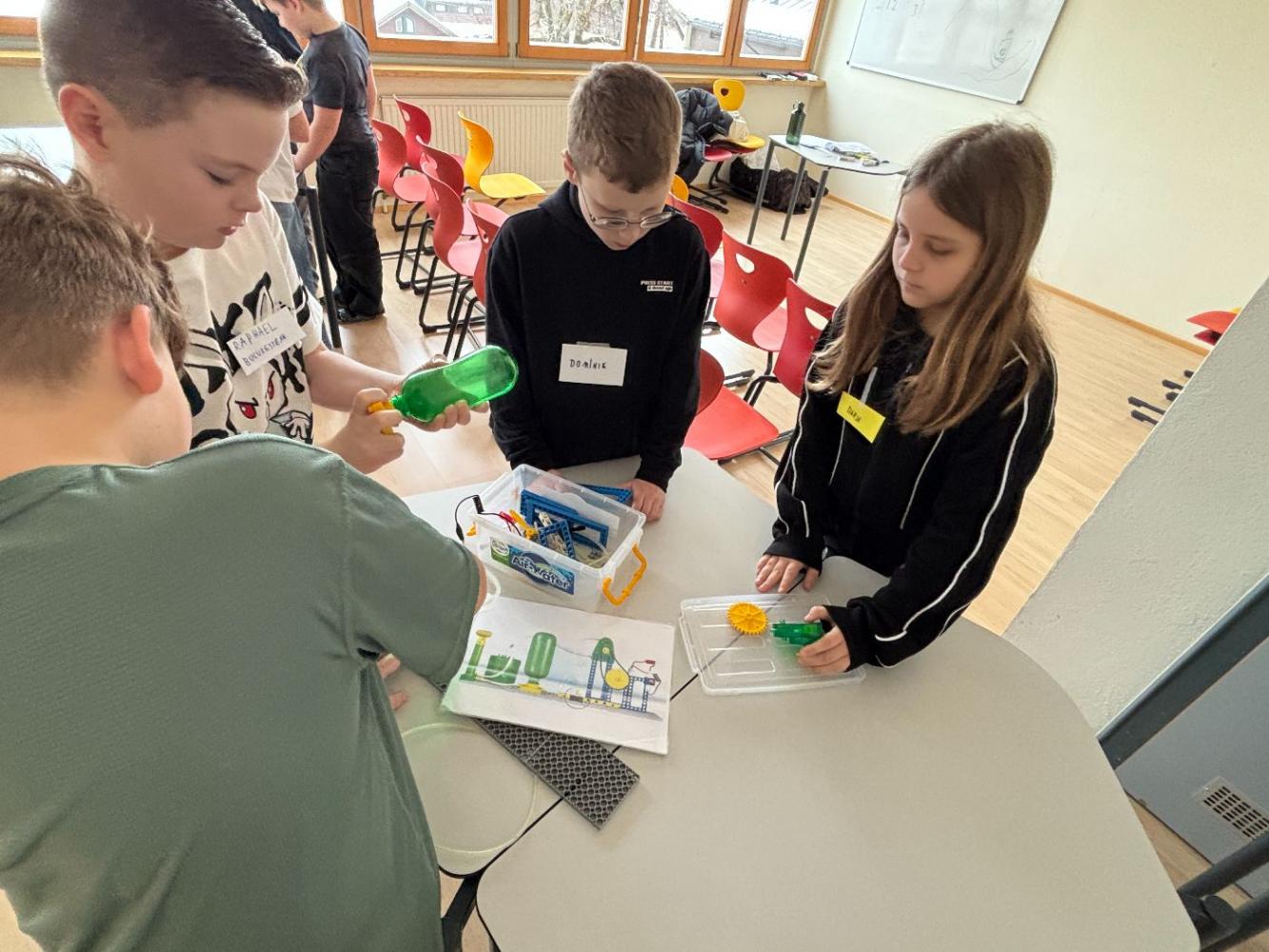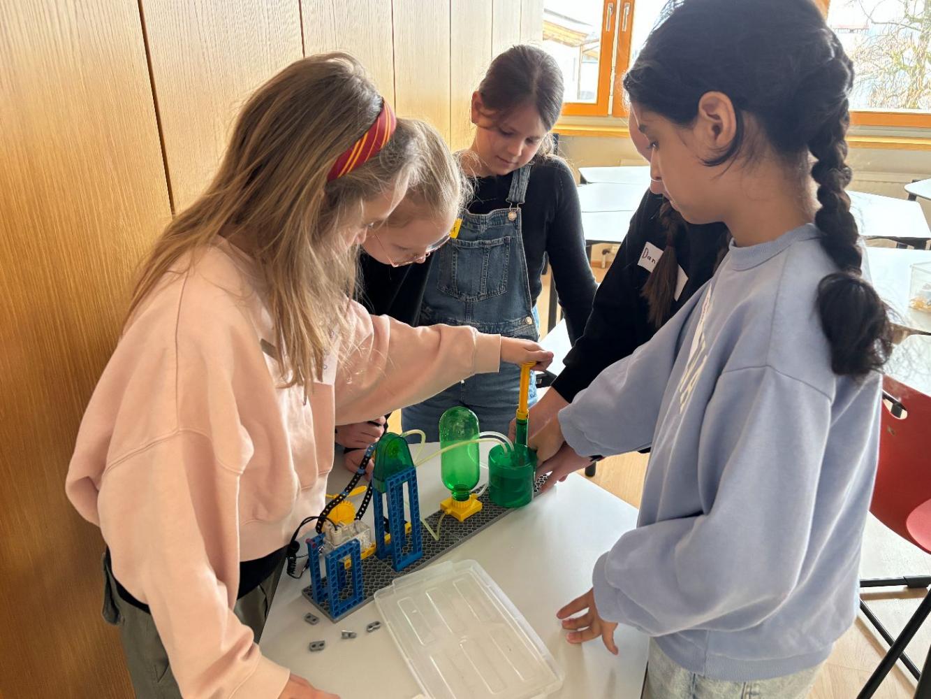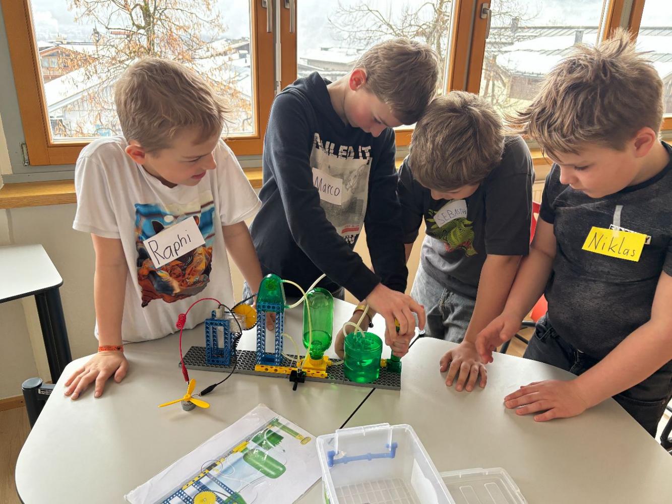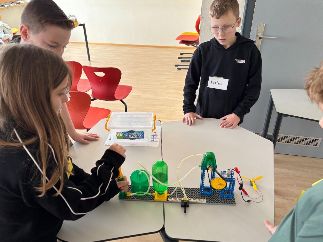 Anschließend wurde es praktisch: In Gruppenarbeiten durften die Kinder selbst zu Forschenden werden. Mit viel Begeisterung bauten sie eigene kleine Wasserpumpwerke und experimentierten damit, wie Wasser als Energiequelle genutzt werden kann. Gemeinsam tüftelten und probierten sie aus, bis am Ende alle Stromkreise geschlossen waren und die Ventilatoren als Verbraucher erfolgreich funktionierten.