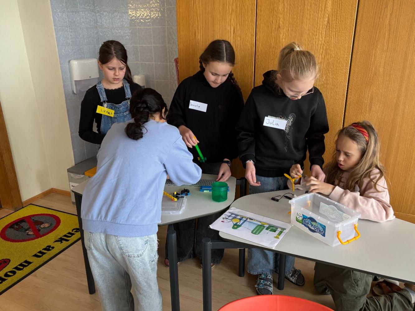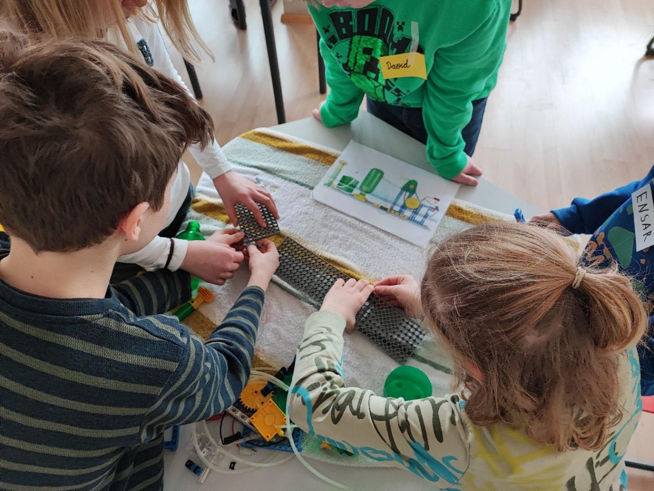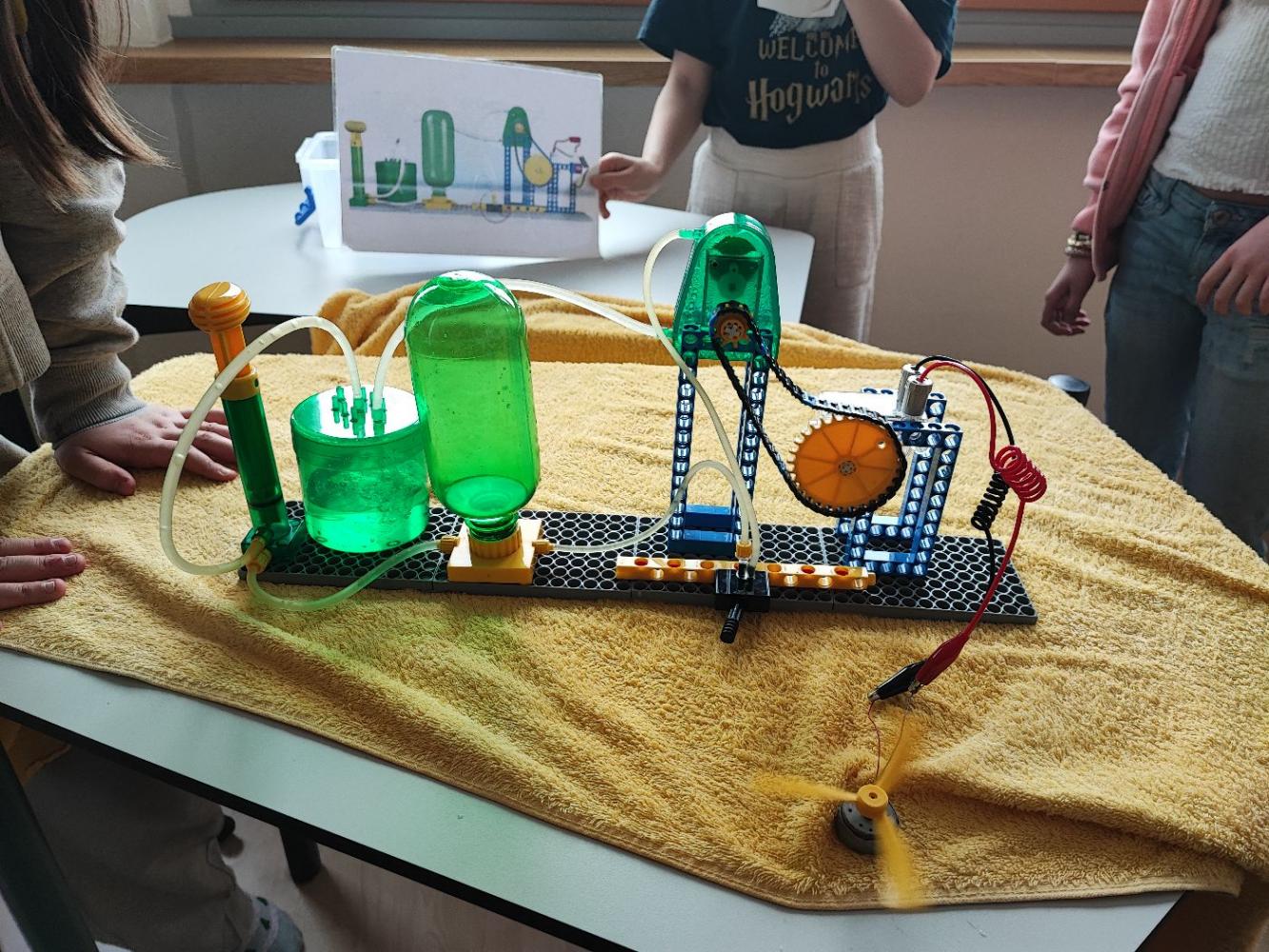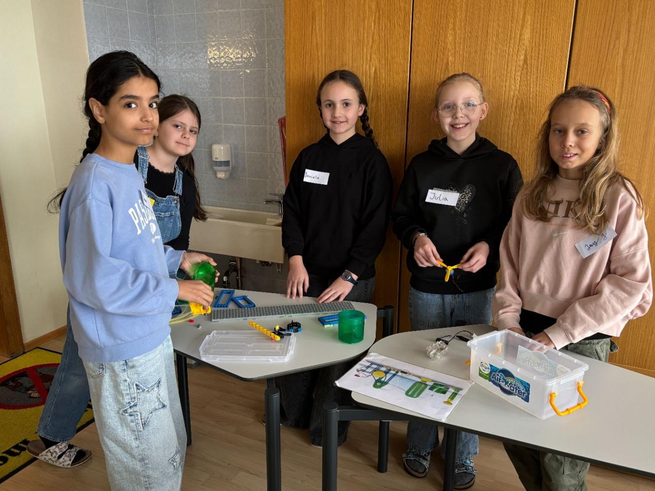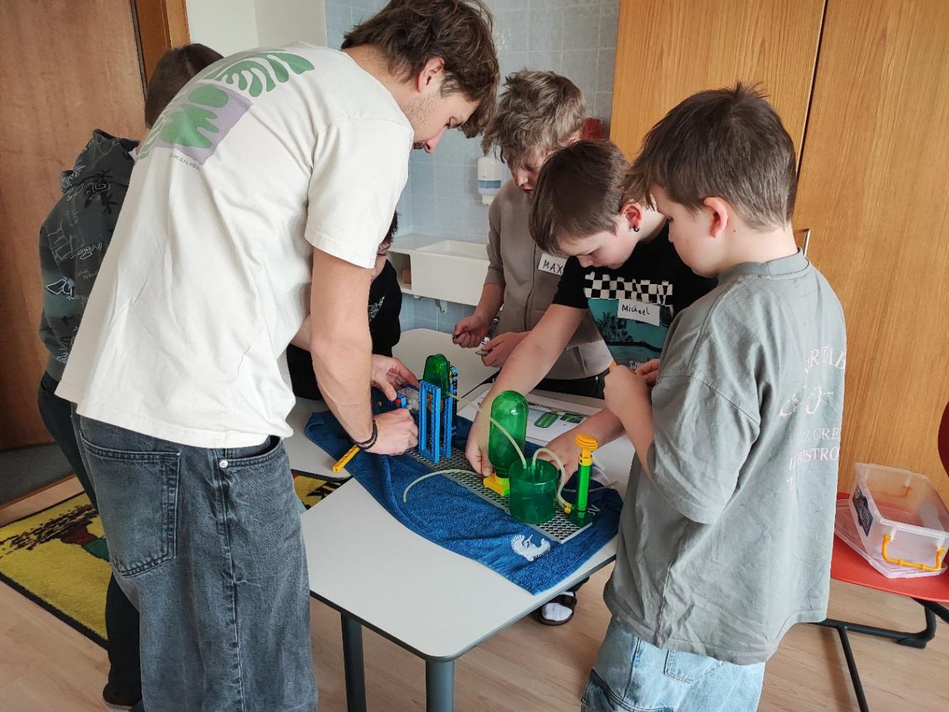 Anschließend wurde es praktisch: In Gruppenarbeiten durften die Kinder selbst zu Forschenden werden. Mit viel Begeisterung bauten sie eigene kleine Wasserpumpwerke und experimentierten damit, wie Wasser als Energiequelle genutzt werden kann. Gemeinsam tüftelten und probierten sie aus, bis am Ende alle Stromkreise geschlossen waren und die Ventilatoren als Verbraucher erfolgreich funktionierten.