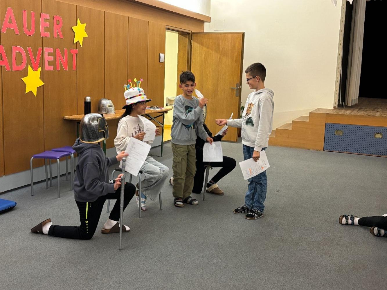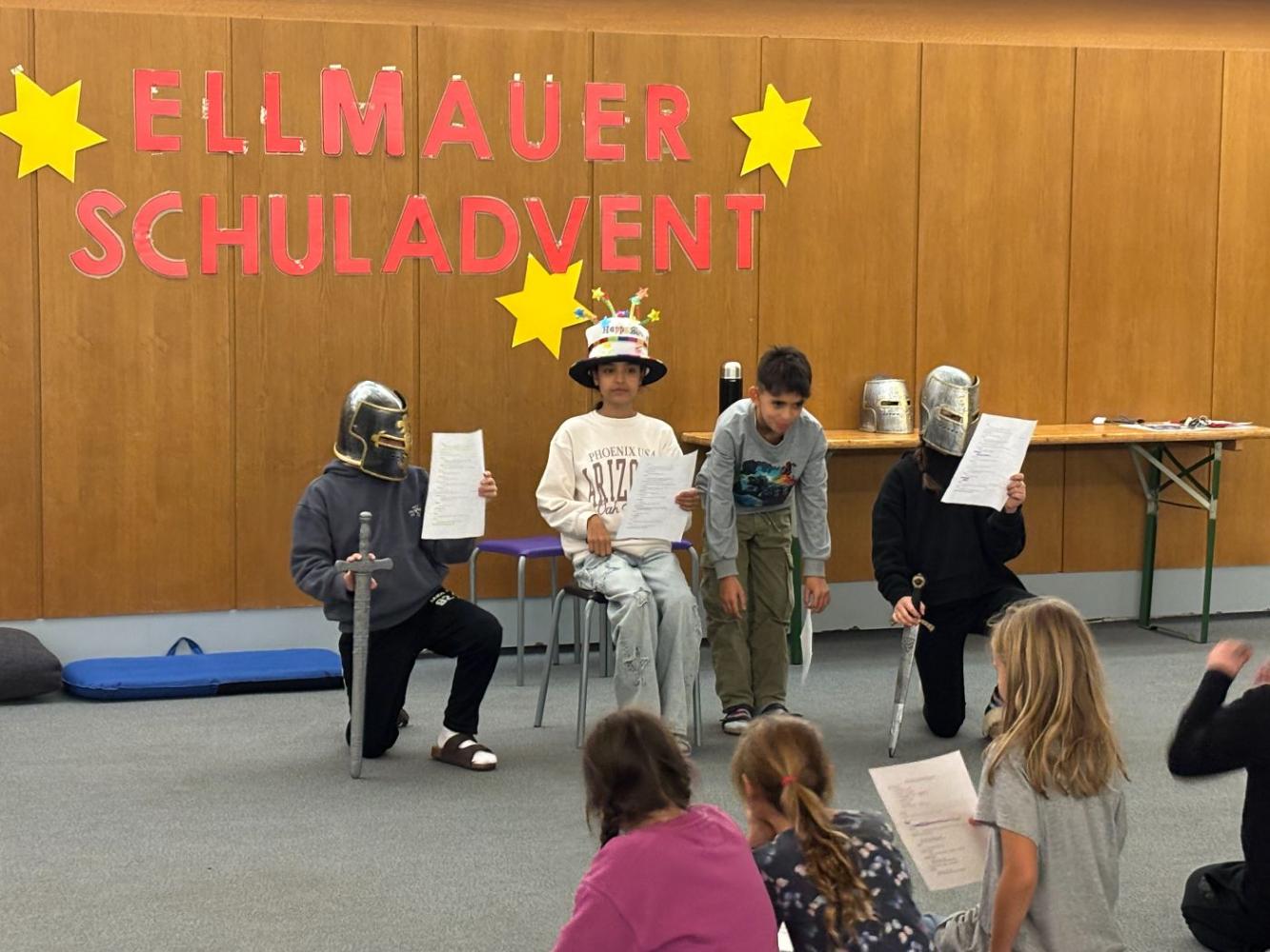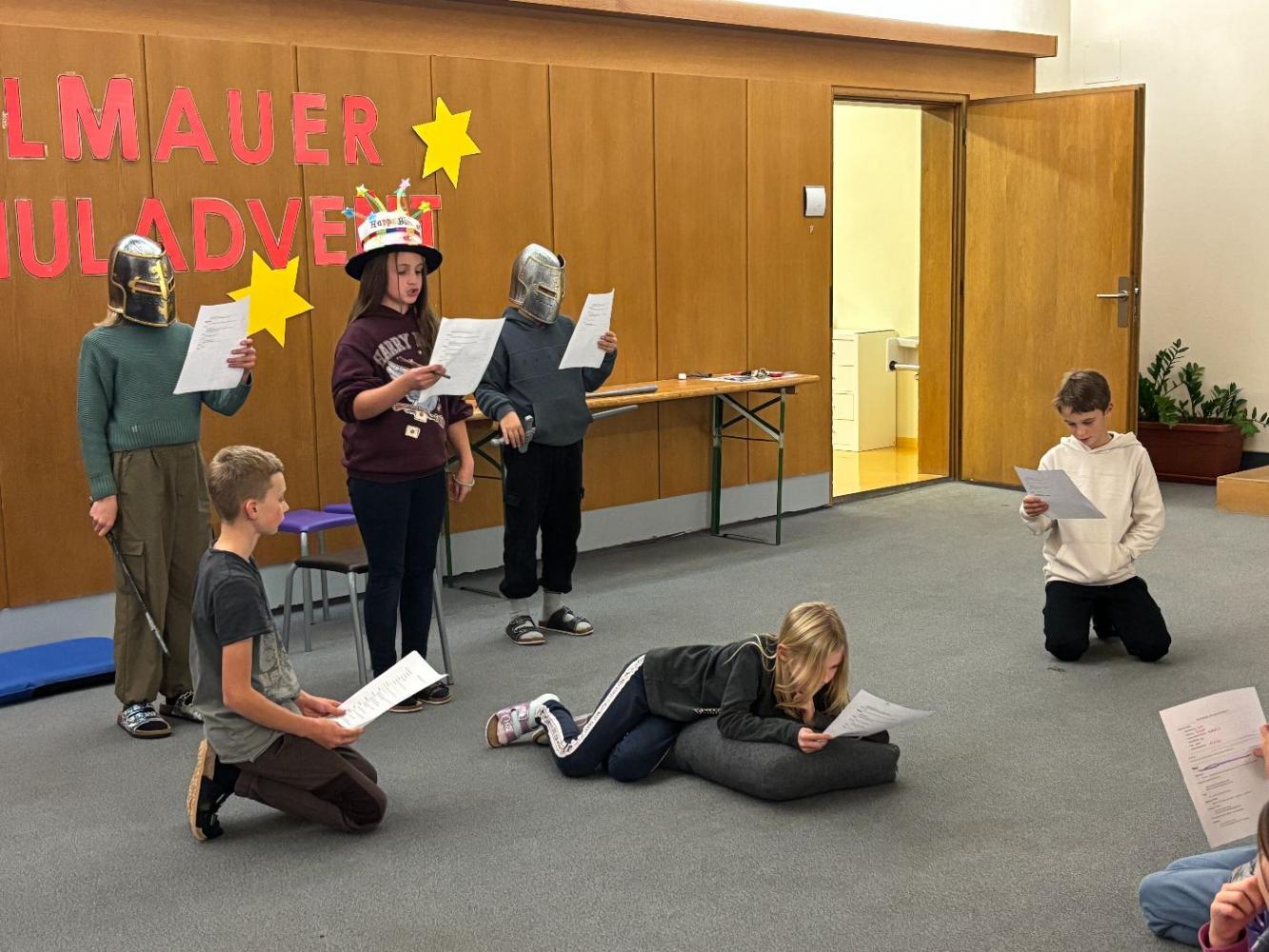 Die Klassenlehrerinnen Sandra Gugglberger und Irene Zott bereiteten in Teamarbeit abwechslungsreiche Stationen vor, bei denen die Kinder in die Welt des Mittelalters eintauchen konnten. Dazu gehörten unter anderem das Basteln von Ritterschildern, das Schreiben mit Feder und Tinte, das Stempeln eines persönlichen Siegels, ein kleines Kinoevent mit Popcorn sowie das Einstudieren lustiger Sketche, die zum Lachen und Mitmachen einluden. Unterstützt wurden die Lehrerinnen dabei tatkräftig von den Kolleginnen Eva-Maria Berger und Sabrina Wieser – herzlichen Dank für euren großartigen Einsatz und eure Mithilfe!