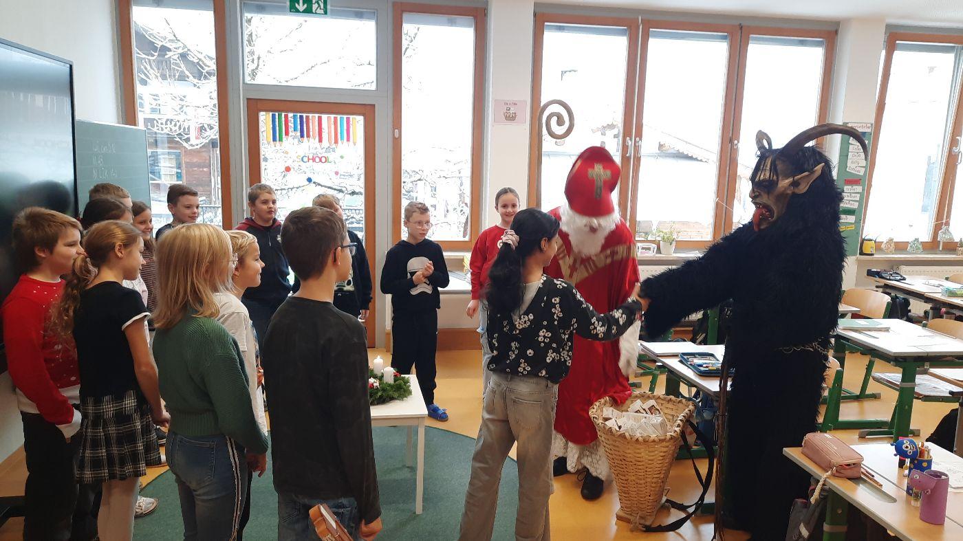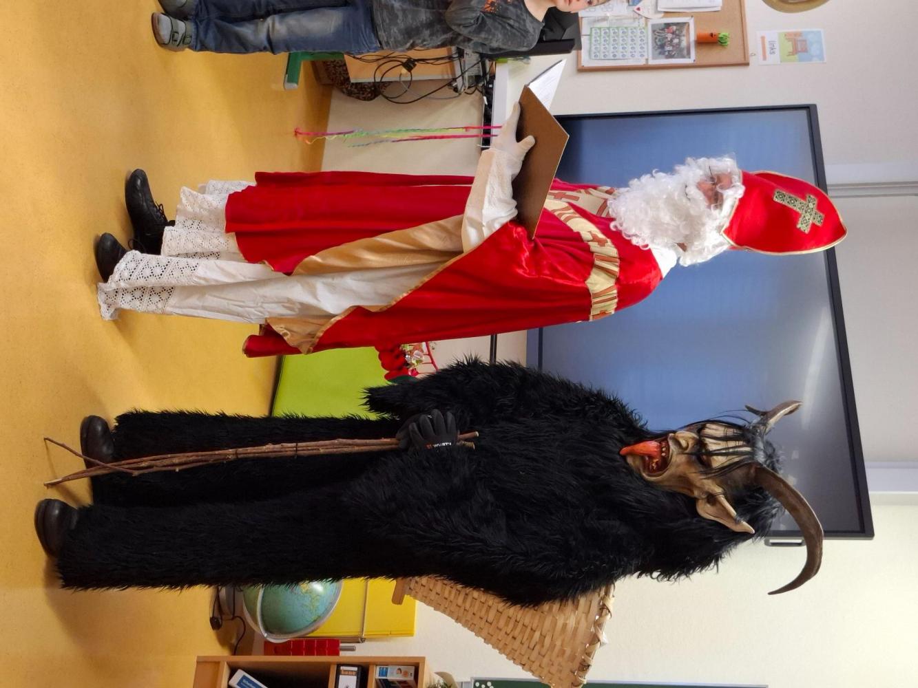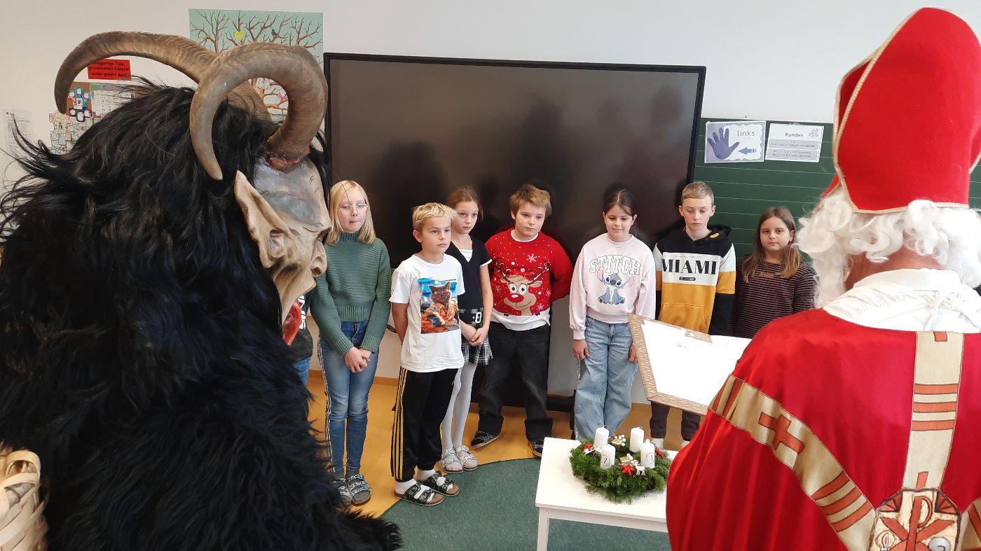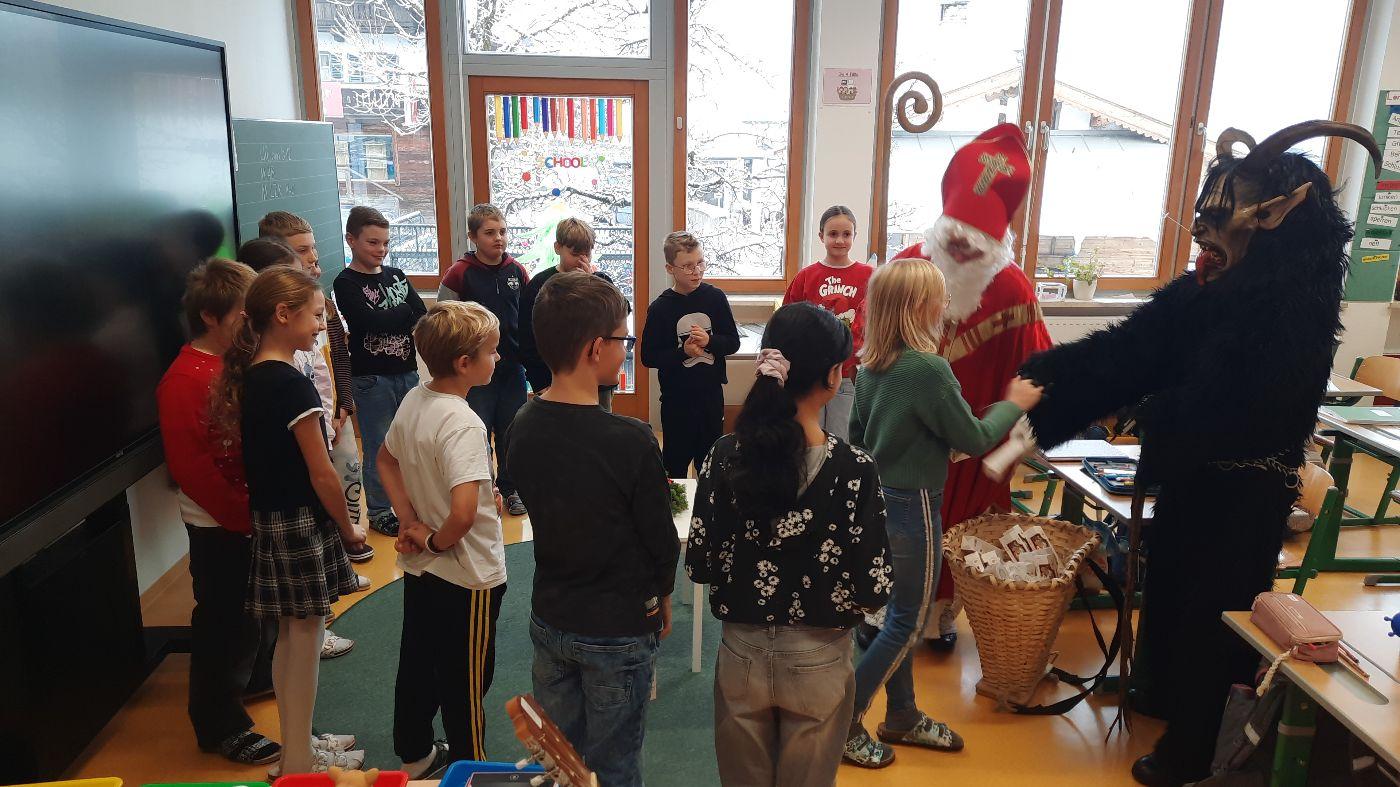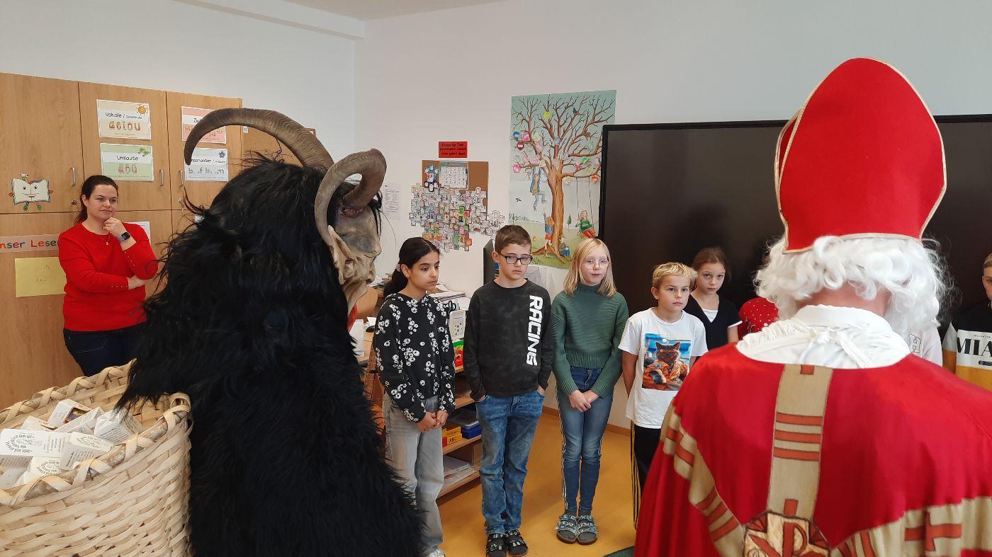 Gemeinsam mit seinem schaurigen Begleiter, dem Krampus, begrüßte er die Schülerinnen und Schüler in ihren Klassen.