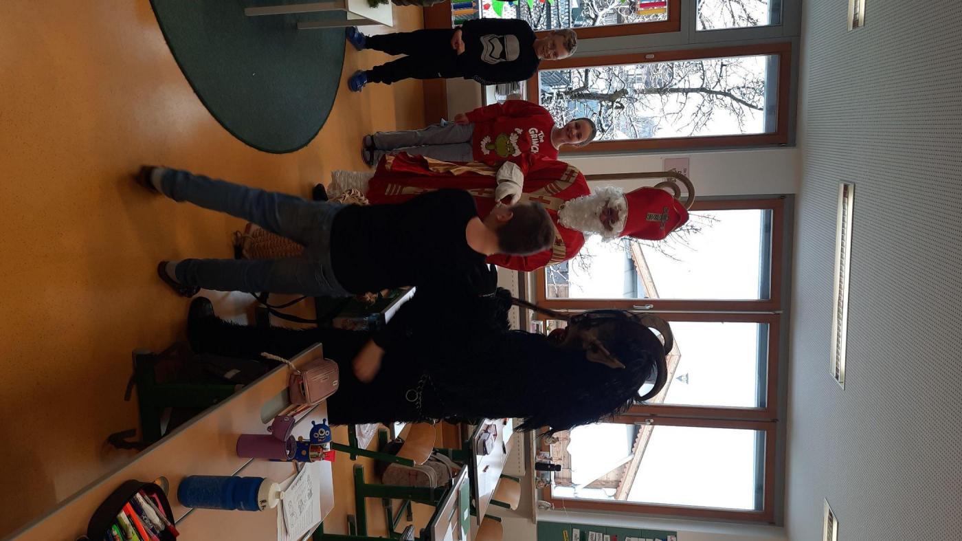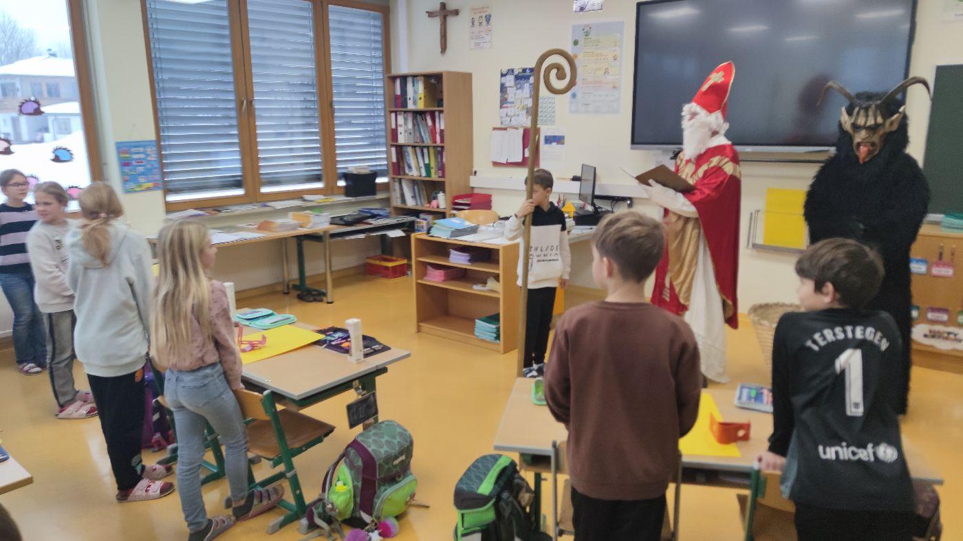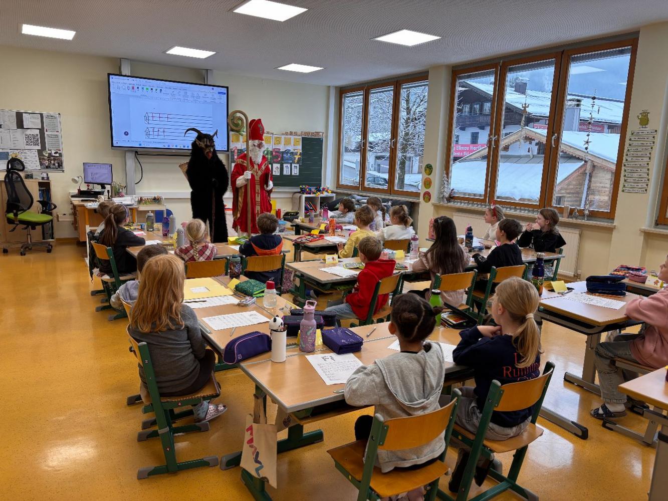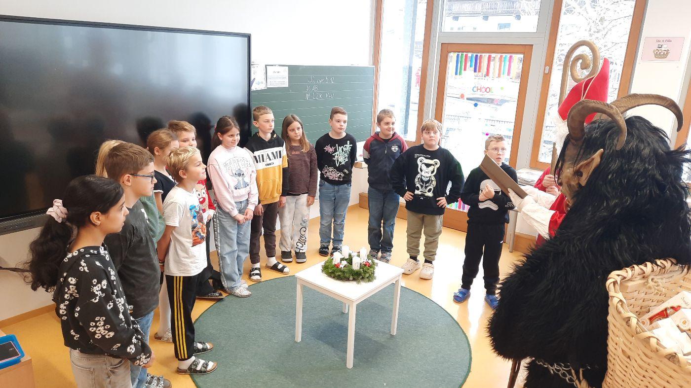 Gemeinsam mit seinem schaurigen Begleiter, dem Krampus, begrüßte er die Schülerinnen und Schüler in ihren Klassen.