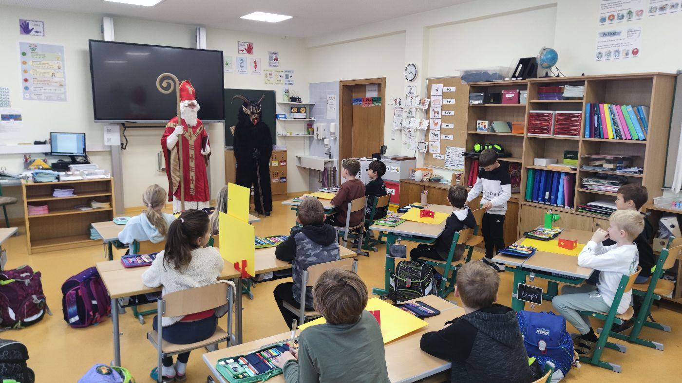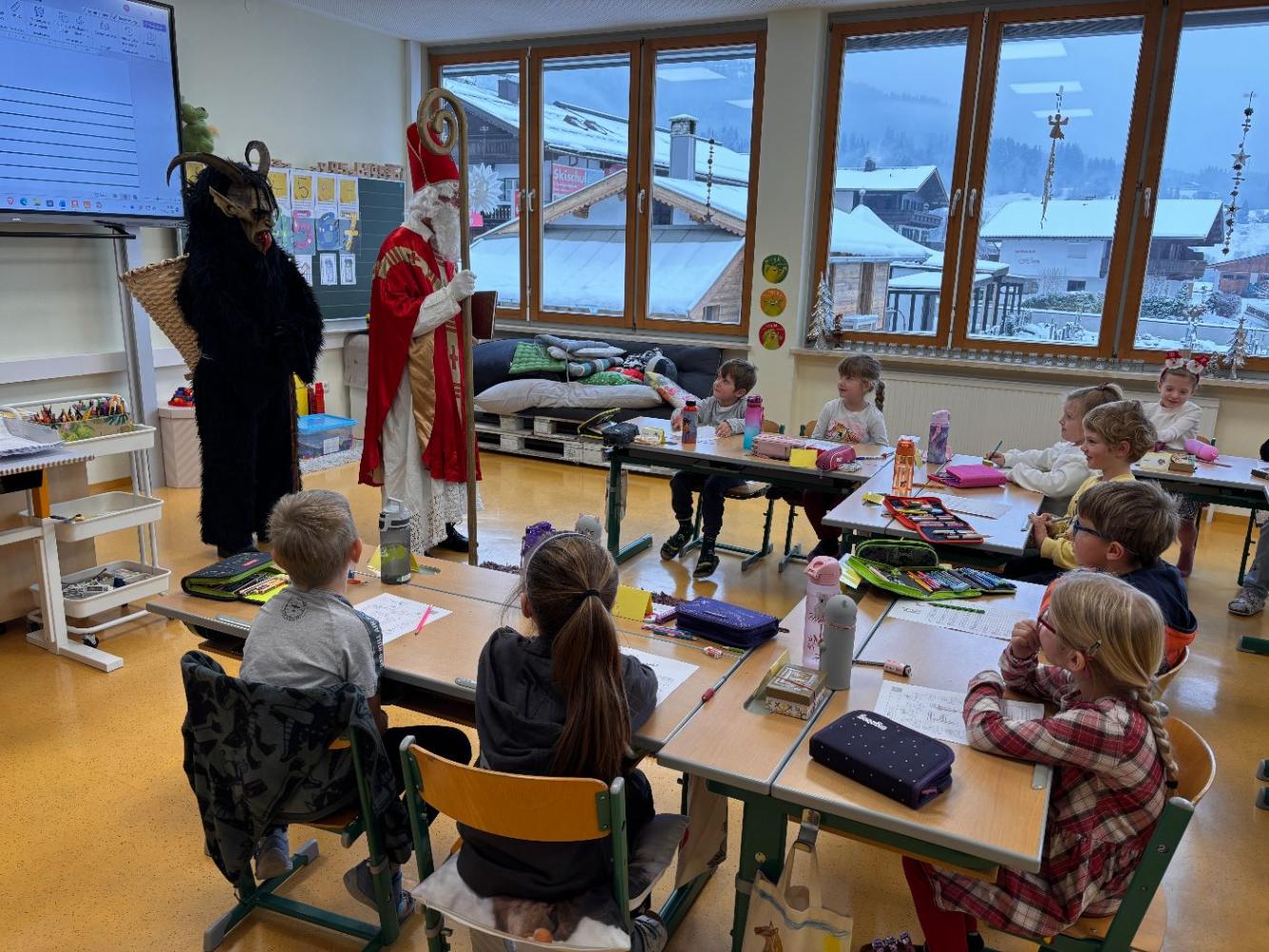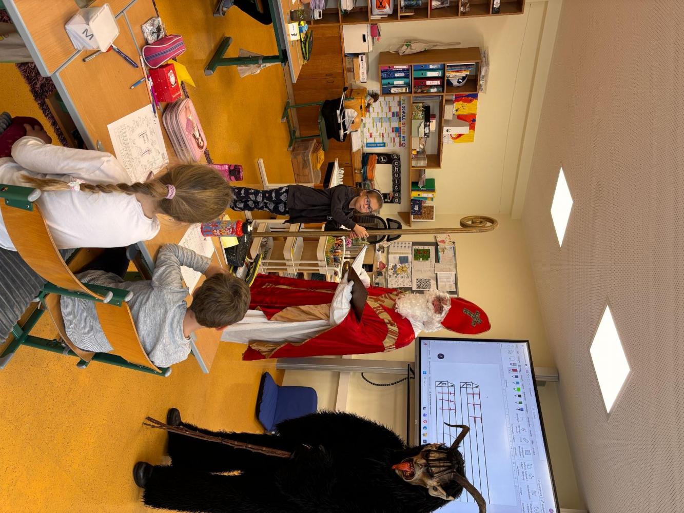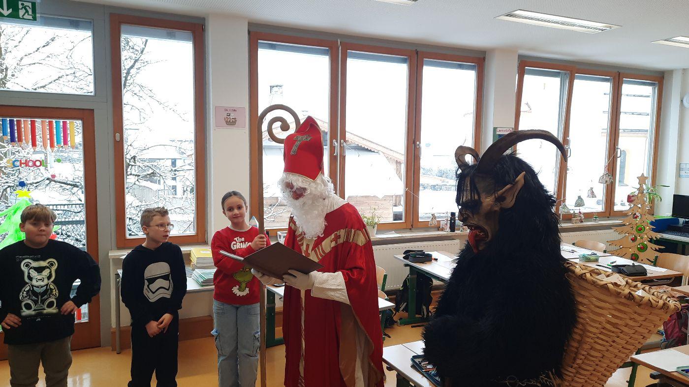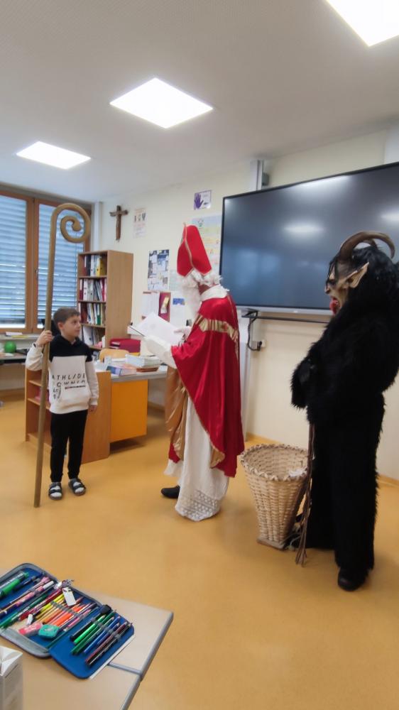 Gemeinsam mit seinem schaurigen Begleiter, dem Krampus, begrüßte er die Schülerinnen und Schüler in ihren Klassen.