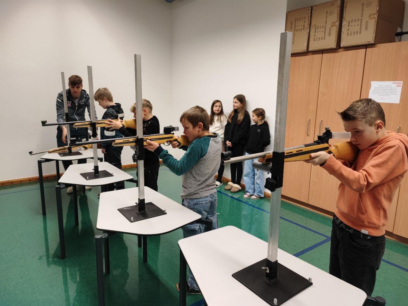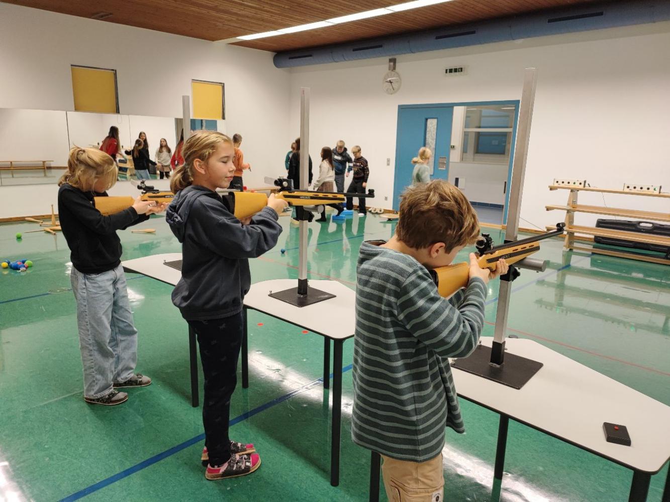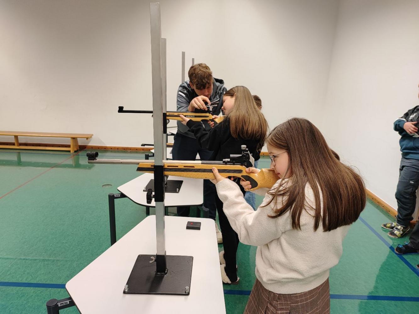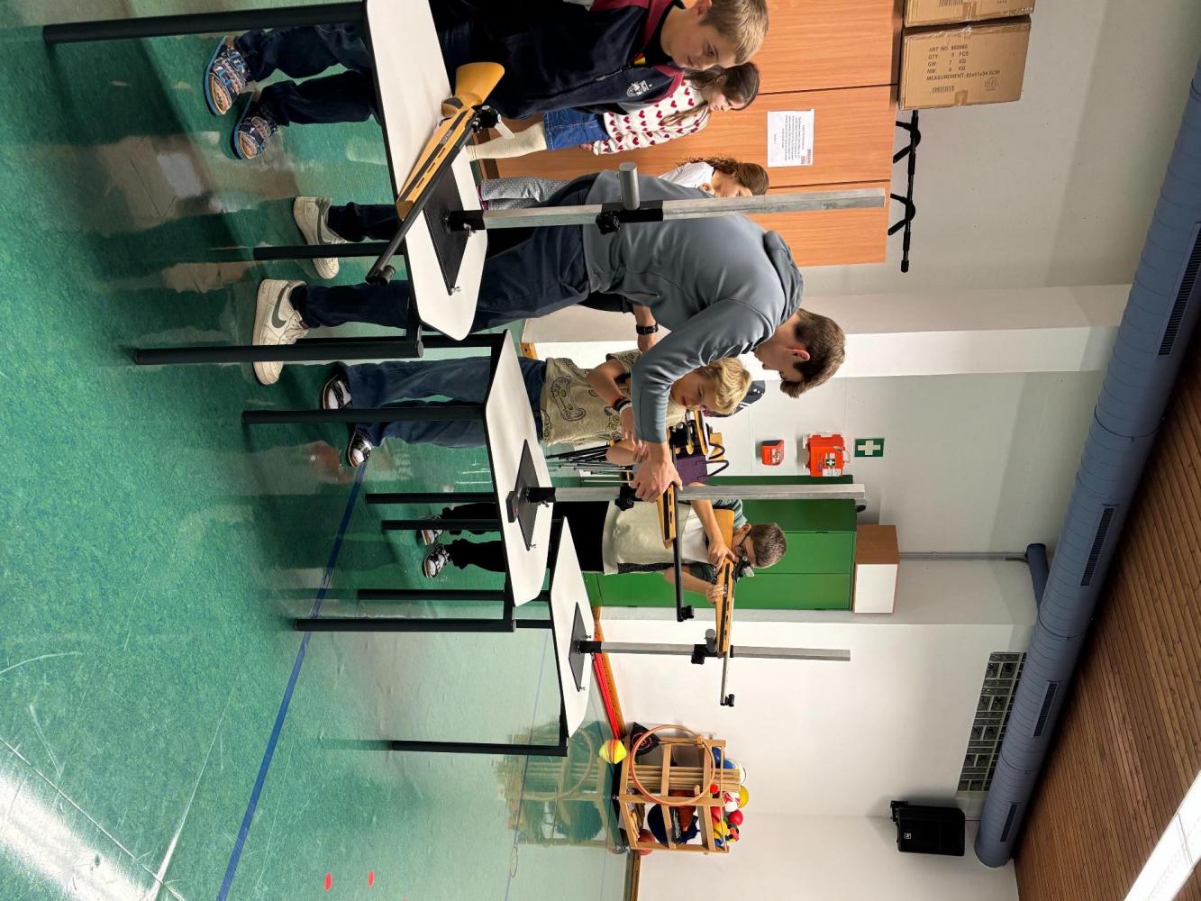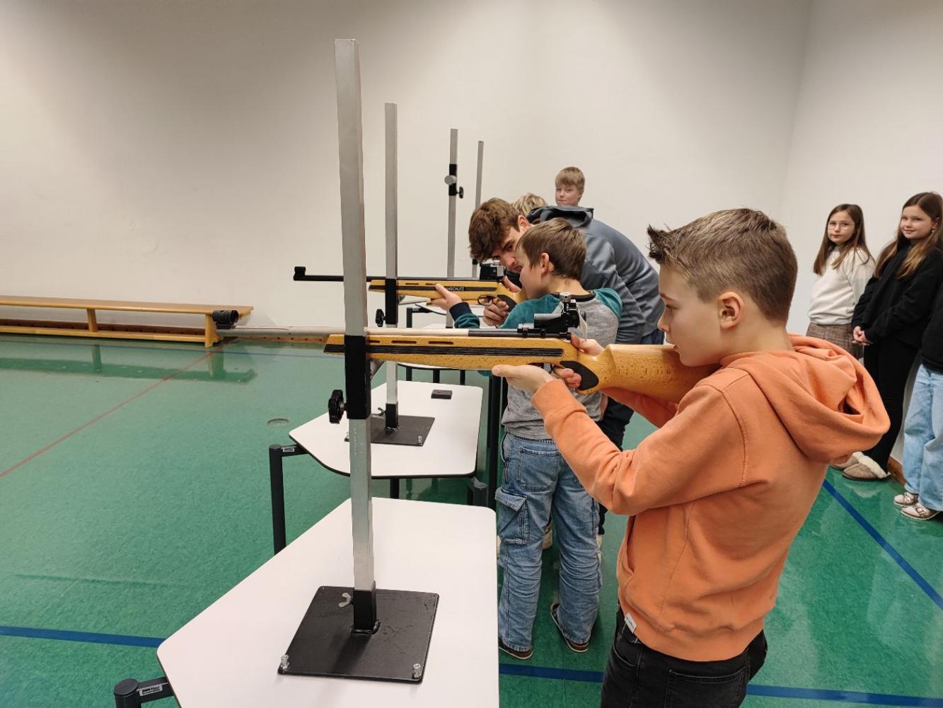 Die Kinder durften anschließend selbst aktiv werden und unter Anleitung mit Lasergewehren verschiedene Übungen ausprobieren. Dabei standen Konzentration, Körperhaltung und ruhiges Atmen im Mittelpunkt. Viele Schüler waren überrascht, wie viel Feingefühl und Disziplin dieser Sport erfordert.