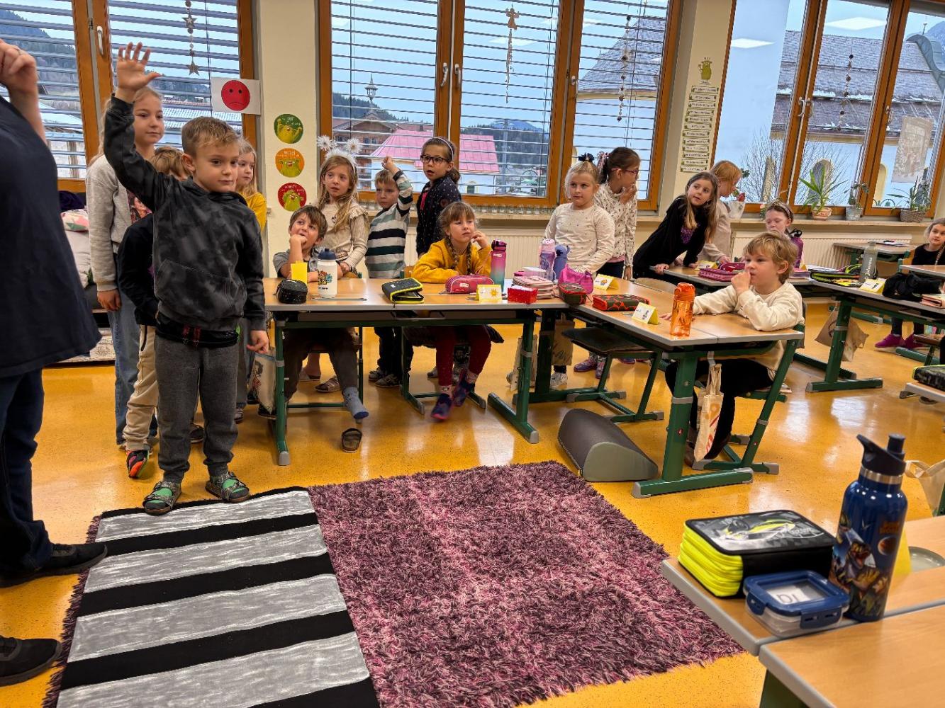Ein besonderes Highlight war die Geschichte von Gurti, dem kleinen Kängurubaby, die den Kindern das Thema Sicherheit auf spielerische Art näherbrachte. Zum Abschluss durfte sich jedes Kind über einen kleinen Gurti freuen. Außerdem bekam die Klasse Gurti und die Känguru-Mama als neue Klassenmaskottchen.
