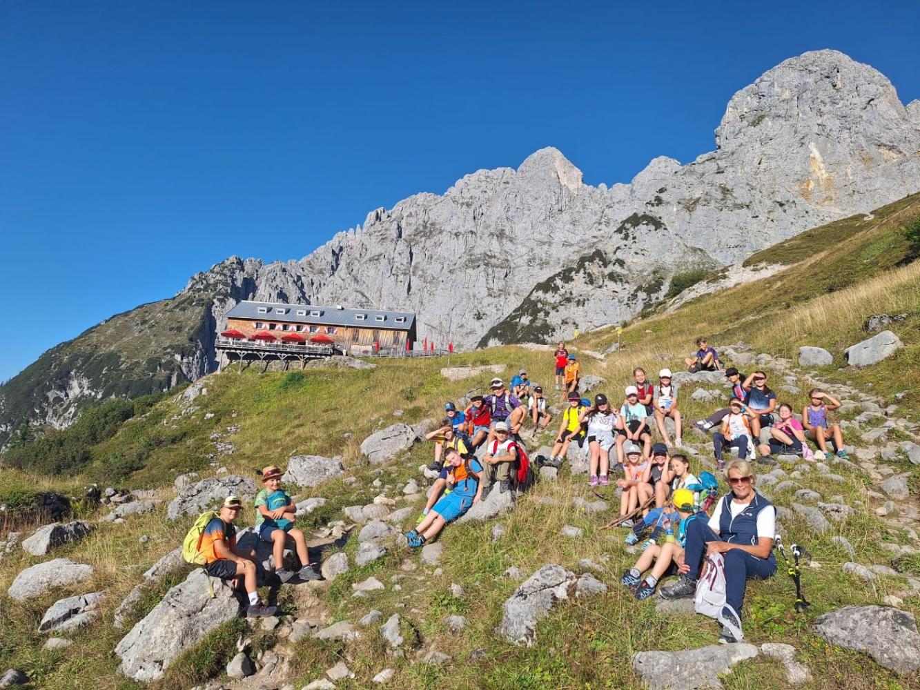 Oben angekommen, wurde die wohlverdiente Jause mit traumhafter Aussicht genossen. Zum Abschluss gab es noch ein Ständchen, bevor wir uns wieder auf den Rückweg zur Wochenbrunneralm machten.